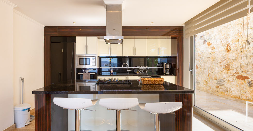 On the entrance floor, there is an open-plan kitchen and a spacious living area with floor-to-ceiling sliding doors providing direct access to the pool terrace.