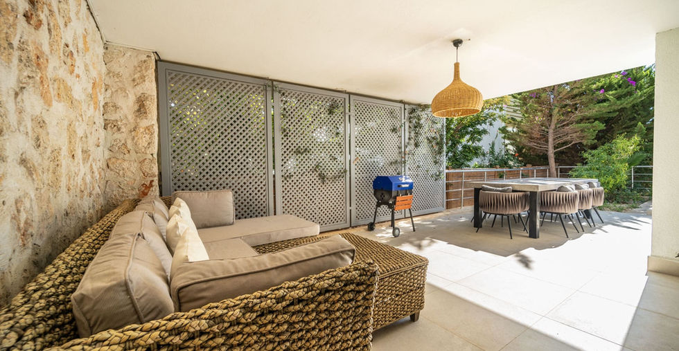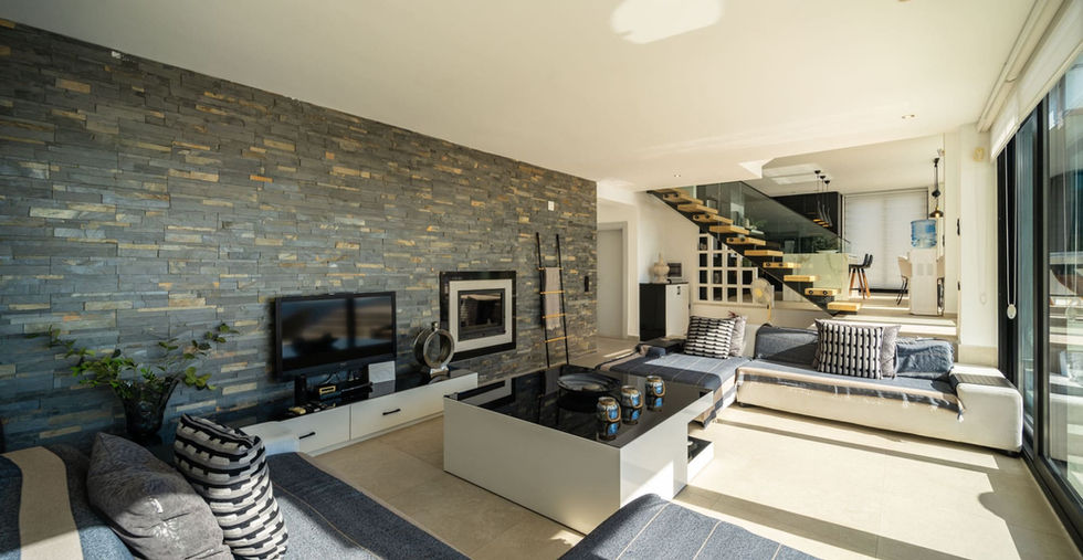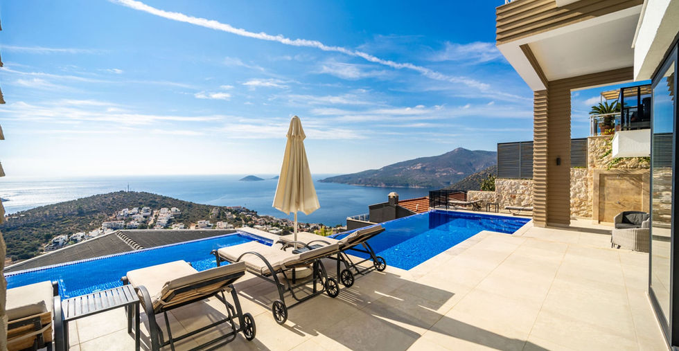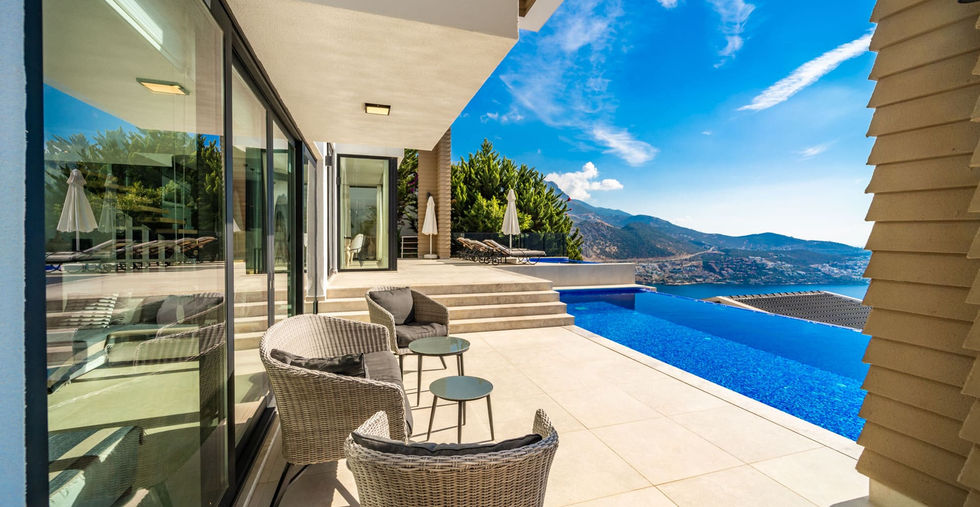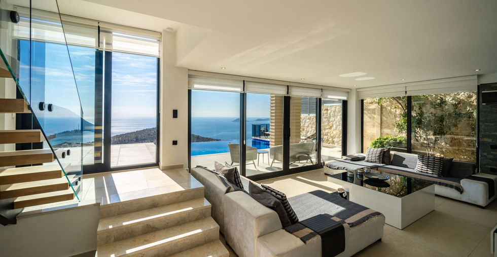 As you step into the villa, you are immediately greeted by breathtaking sea views, perfectly framed by expansive floor-to-ceiling windows and sliding doors. The villa is exquisitely designed throughout, featuring a spacious open-plan, split-level living area and a sleek, modern kitchen with a porcelain-topped finish and a stunning waterfall-style island. The contemporary living space seamlessly connects to a beautiful patio, complete with a large heated infinity pool and jacuzzi—ideal for enjoying during the cooler early or late season months when the weather is warm but the pool water might be chilly.