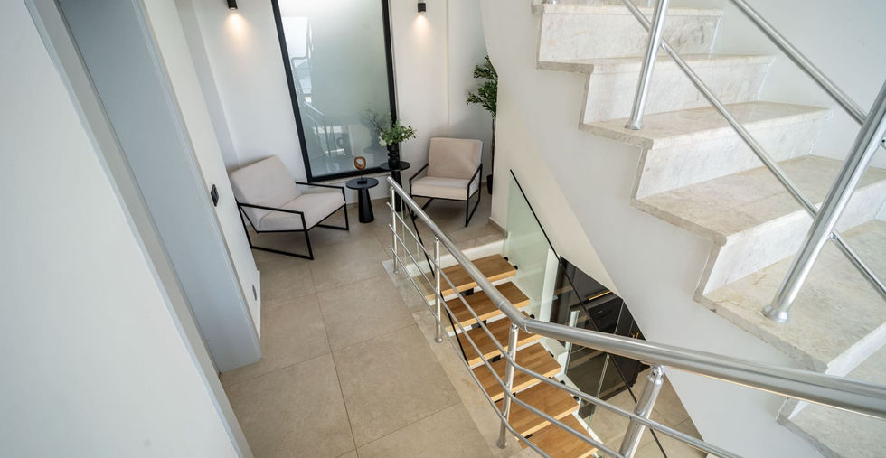 Villaya adım attığınızda, geniş tavandan tabana pencereler ve sürgülü kapılarla mükemmel bir şekilde çerçevelenmiş nefes kesici deniz manzaralarıyla hemen karşılaşıyorsunuz. Villa, geniş, açık planlı, iki katlı bir oturma alanı ve porselen üstlü şık, modern bir mutfak ve çarpıcı şelale tarzı bir ada ile baştan sona zarif bir şekilde tasarlanmıştır. Çağdaş yaşam alanı, hava sıcakken ancak havuz suyu soğuk olabilirken serin erken veya geç sezon aylarında keyfini çıkarmak için ideal olan büyük bir ısıtmalı sonsuzluk havuzu ve jakuzi ile tamamlanan güzel bir verandaya sorunsuz bir şekilde bağlanmaktadır.